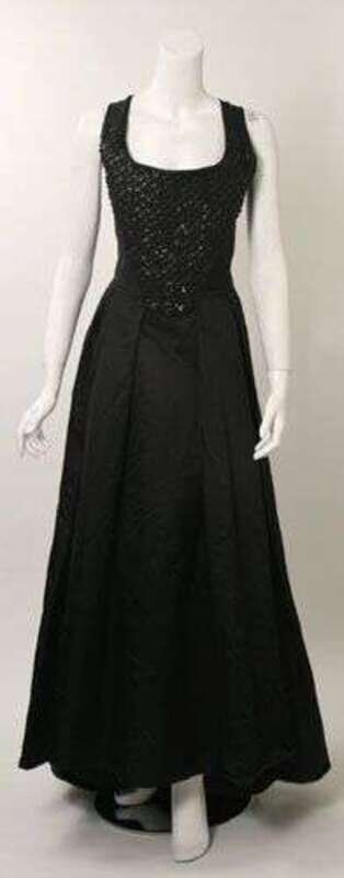Swiss waist style beaded bodice with narrow shoulder straps, long satin skirt with a slight train. Labeled "Pamela Dennis," size 8.