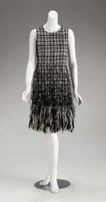 Sleeveless black and white bouclé tweed cocktail length sheath dress with bead, ostrich feather and rhinestone accents and with wool-fringed and tulle hem. Labeled "Oscar de la Renta," size 6.