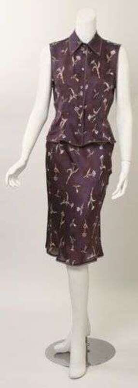 Sleeveless blouse and bias-cut skirt in floral-printed aubergine satin chiffon. Size 42.