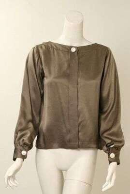Charcoal gray double-breasted peaked lapel blazer with a short skirt, size 42, with a back-button boat neck olive green silk satin blouse, size 36. Both labeled "Yves Saint Laurent / Rive Gauche."