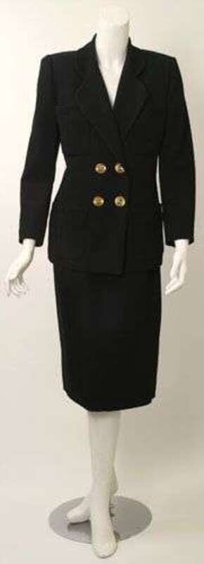 Double-breasted two-button closure, rounded notched lapels with four gored patch pockets, large gold "clover" buttons, with a straight below-the-knee skirt. Labeled "Chanel Boutique," size 42.