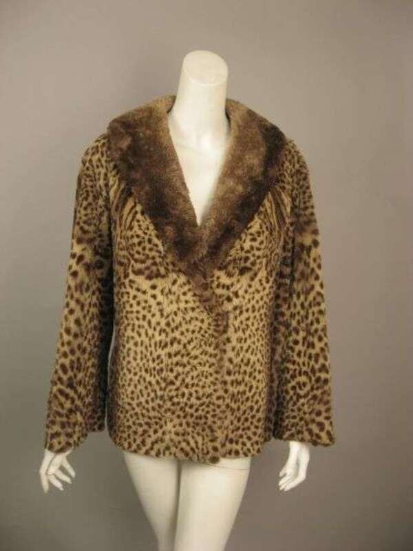 Possibly shorn ocelot, with a plain fur shawl collar, single hook closure, hip-length with three-quarter sleeves. Labeled "La Parisienne Tailor & Furrier / Collingswood NJ."