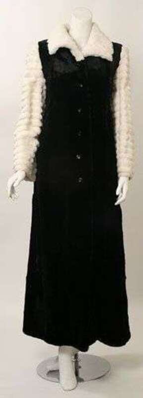 Full-length black single breasted coat in silky black shorn mink, with white fluted collar and sleeves. Labeled "Oscar de La Renta Furs" and "Furs by Leo Diutsh / Boston."
