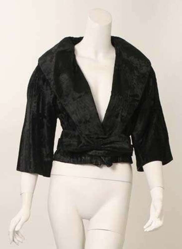 Shawl collar and swing silhouette, open front. With two broadtail belts, one cummerbund style and the other with a "bow" detail.