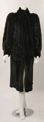 Dark mink with mutton sleeves and tie-belt, collarless. Labeled "Leon Vissot / Paris," etc.