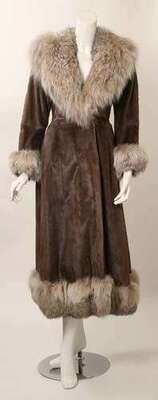 Shorn caramel fur with silver fox oversized shawl collar, nipped waist and full sweeping skirt, with fox trim at cuffs and hem. Labeled "Alfred Rainer / New York."