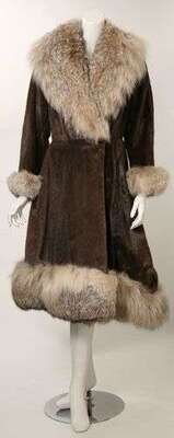 Shorn caramel fur with silver fox oversized shawl collar, nipped waist and full sweeping skirt, with fox trim at cuffs and hem. Labeled "Alfred Rainer / New York."