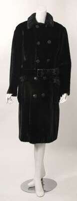 Double-breasted with leather-covered buttons, peaked collar, large patch hip pockets and a self-belt. Labeled "Bergdorf Goodman Men's Shop."