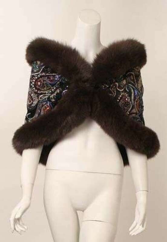 Elaborate paisley bead and embroidered shrug with dyed fox edging, single button closure and lined in black silk satin.