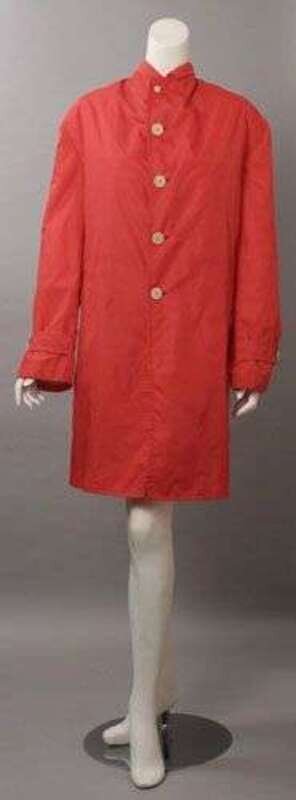 Neon red boxy three-quarter length windbreaker style button-down coat. Labeled "Comme des Garçons / Homme Plus," size large.