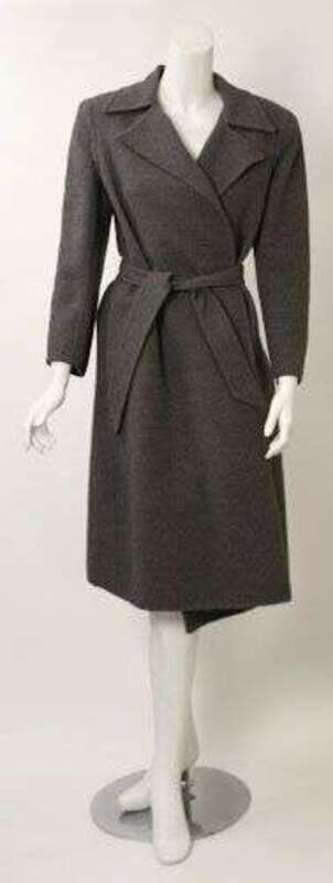 Mid-tone grey wool flannel wrap coat with a peaked collar and self-belt. Labeled "Geoffrey Beene New York."