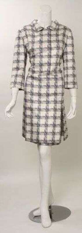 Silk twill long-sleeve tunic with printed "plaid" motif, hidden-snap closures at placket, double-vent at the front, with a matching underskirt. Labeled "Givenchy" and with "39654" written on tape label, verso.
