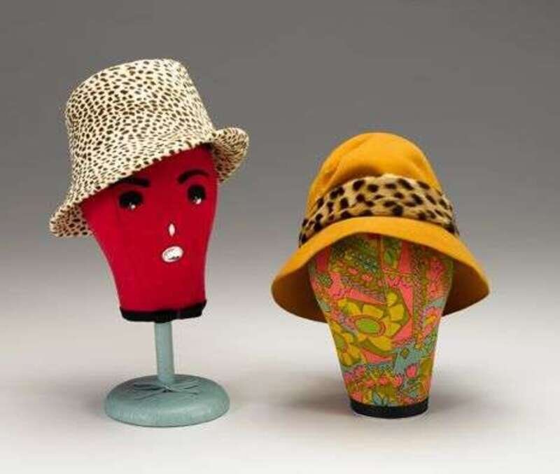 One in an exotic cat pattern-printed calf hair labeled "Made to Order Hat / Bergdorf Goodman," the other in umber felt with a leopard fur band, labeled "De Pinna Salon."
