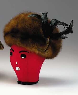 Golden sable turban-style hat with iridescent pheasant and cock feather detail, labeled "Adolfo at Saks Fifth Avenue."