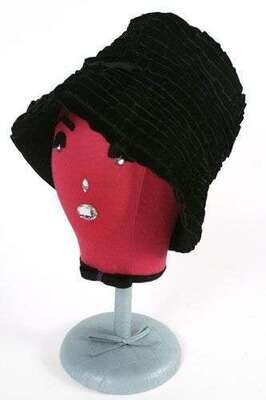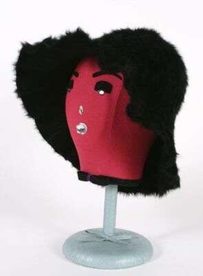 One in shirred velvet ribbon from Mr. John; the other in felted fur with a slightly flared brim, labeled "Made in Italy."