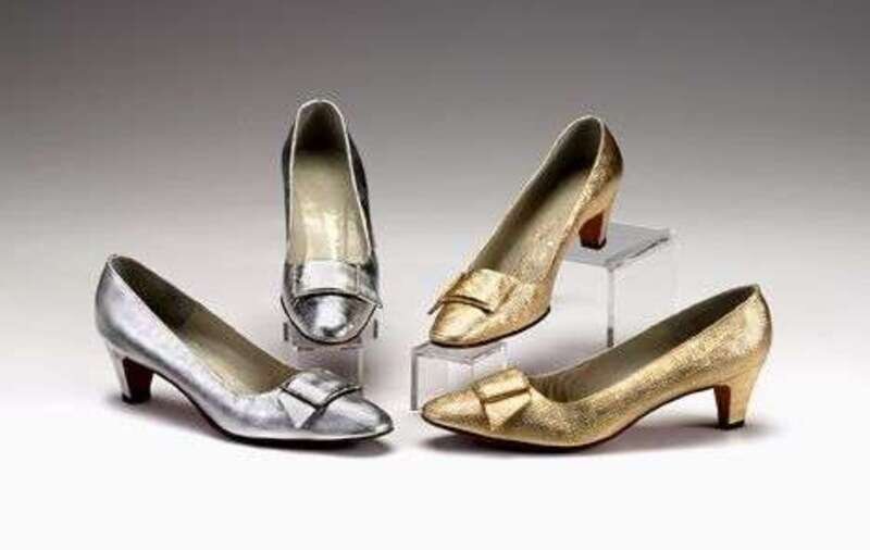 Both with narrow rounded toes and a rhinestone buckle, two-inch heel, one in gold and the other silver. Size 7AA.