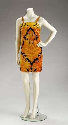 Saffron yellow and black upholstery-style fabric in an urn and floral spray pattern, straight sheath shape with narrow straps, back zip. Labeled "Rudi Gernreich."
