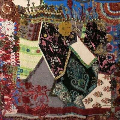In a printed patchwork of oriental and floral motifs, faced in silk.