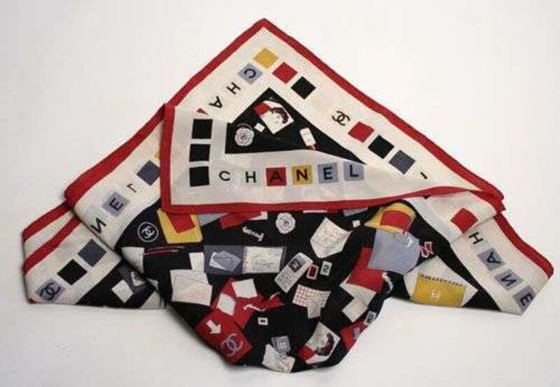 With various signature motifs, in red, black, gray, and yellow printed in cream.