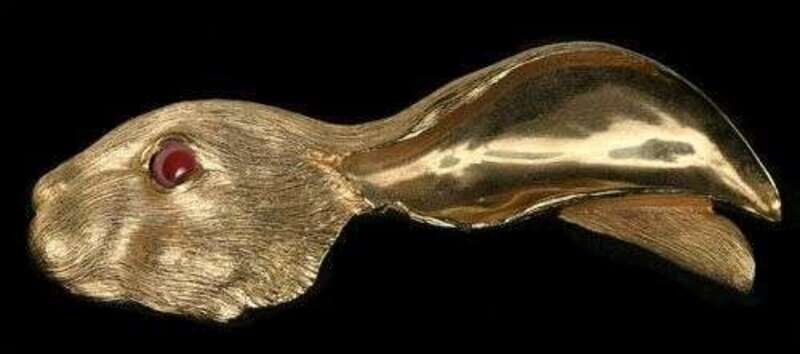 Dramatic hand-cast rendering of a hare's head with long ears and pink and red glass eye. Signed 1985 and with signature, indistinct.