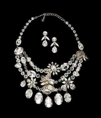 Consisting of three tiers of large variously shaped clear faceted "jewels" and applied jeweled florets and pewter insects, with seven large drops at the longest tier. Also with a pair of coordinating earrings for pierced ears, with original box and pouches.