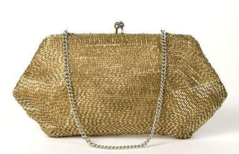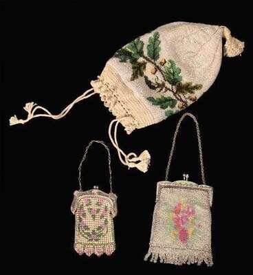 Including a crochet and beaded pouch; a very small enameled metal mesh Whiting and Davis purse; another slightly larger chain mail mesh purse with a green enamel frame; and a gold beaded evening bag of more recent vintage.