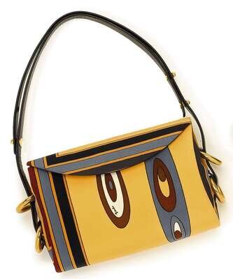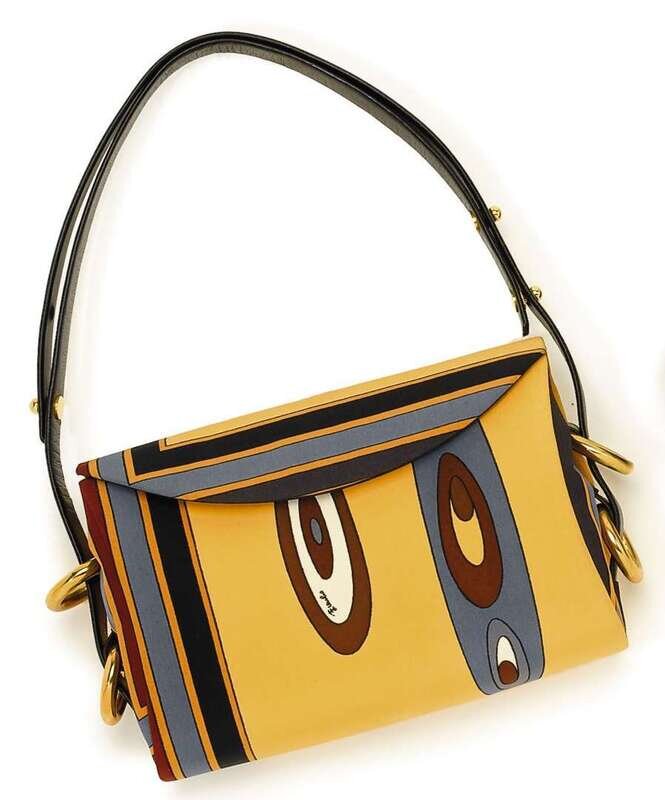 Bright canary yellow printed with grey and earth tone geometric designs, with black leather single strap and brass loops at the side, hidden snap at the front flap closure. Lined in black leather and embossed "Emilio Pucci."
