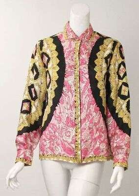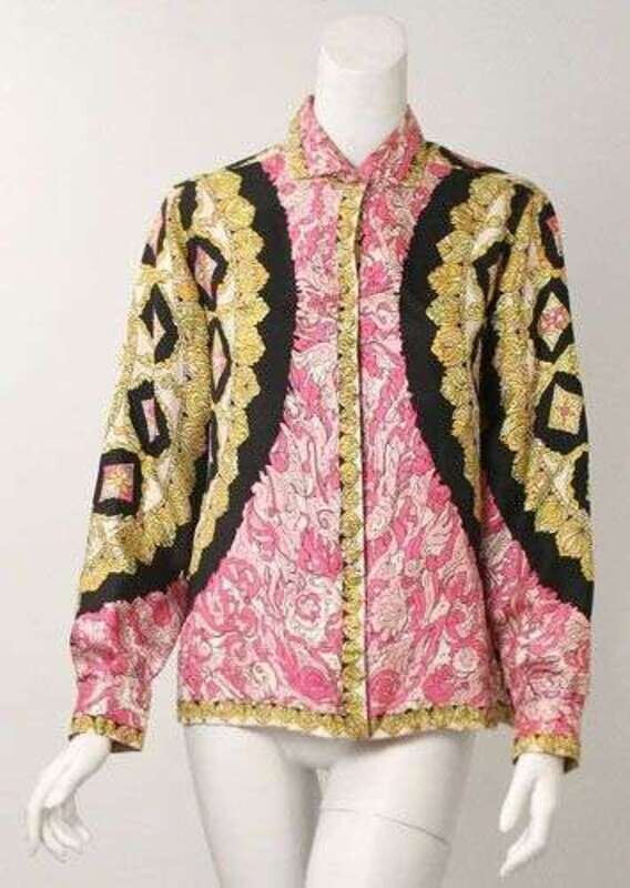 In black, golds and pinks. Labeled "Emilio Pucci," etc., and "Saks Fifth Avenue," size 12.