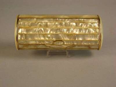 Two cylindrical evening bags, one beaded and the other pearlescent lucite, the last a black beaded purse with a beaded "twist" handle and zip closure.