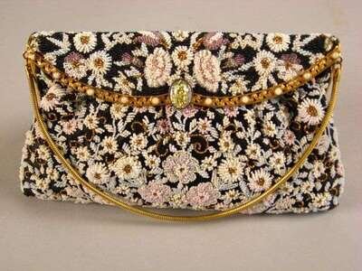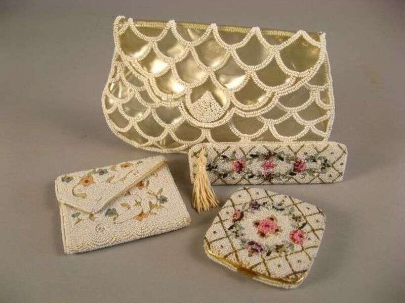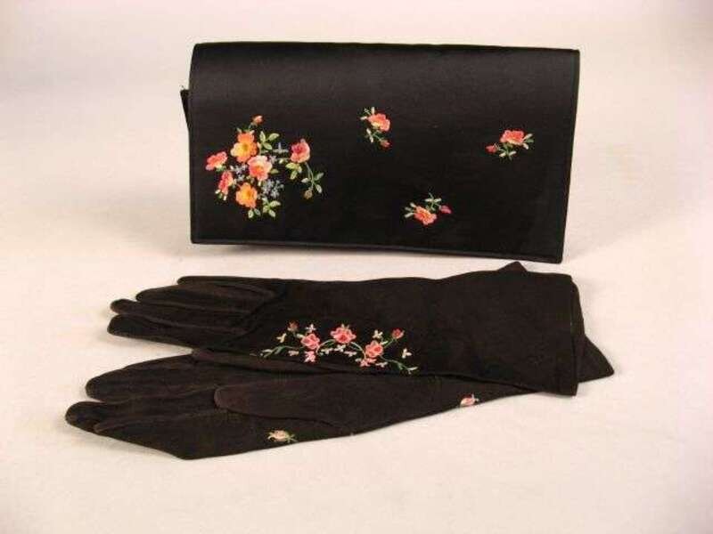 A flat black satin clutch with floral embroidery with a similar pair of satin gloves, both French; a floral beaded chain-handle purse labeled "Ed B Robinson;" and a clear plastic and beaded clutch labeled "Bags by Josef / Hand Made in France" with a group of small beaded accessories.