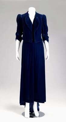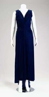 Sleeveless V-neck bodice with shirred and ruffled detail at shoulders, low open back with gathered and draped skirt at the back trailing to a short train; matching jacket with shirred three-quarter length sleeves. Labeled "Importer Beneway / Hartford, Conn." Dress unlined, approximately size 2-4.
