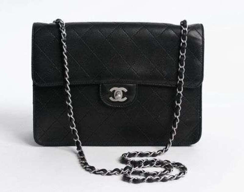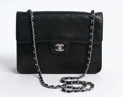 Matte black calfskin with front-flap and "CC" logo turn-lock latch, long single chain shoulder strap, brushed silver metal hardware. Partially lined in leather, embossed "Chanel / Made in France."