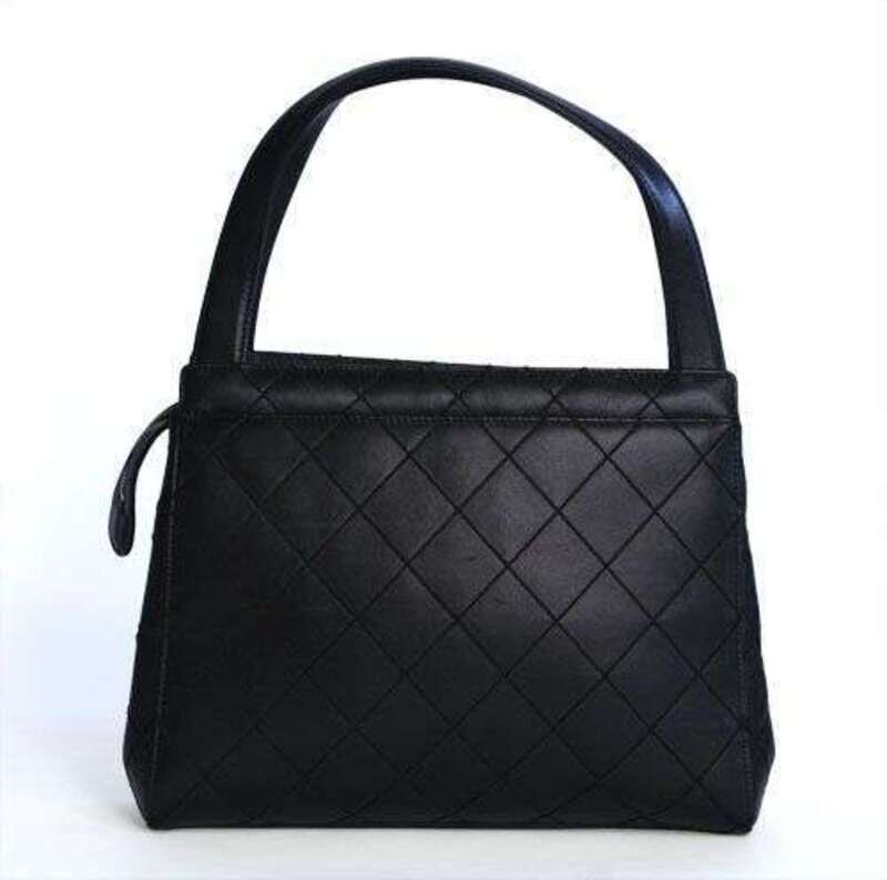 Small tote-style bag in matte black leather with signature quilted design in thin piped topstitching, two leather top handles, exterior and interior pockets and zip-top closure. Lined in leather and embossed "Chanel."