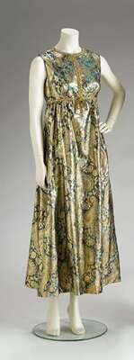 sleeveless bodice with a slightly raised waist and full-length skirt, in a vibrant blue, green and gold brocade with gold braid trim and rhinestone accents. Labeled "Malcolm Starr International / Designed by Rizkallam," size 10.