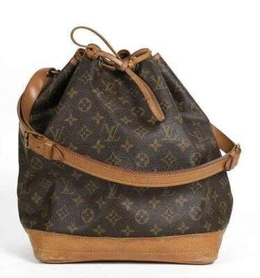 Classic bucket purse with leather trim and draw-string closure, leather shoulder strap.
