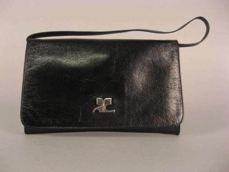 Glossy black calfskin with narrow short handle and silver logo over the snap closure. Lined in white embossed "Courreges / Paris / Made in France."