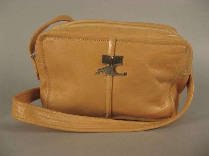 Naturally tanned undyed leather with medium leather shoulder strap, top zip and large silver logo detail on the front. Lined in cream grosgrain with leather label embossed "Courrèges / Paris / Made in France."