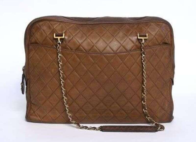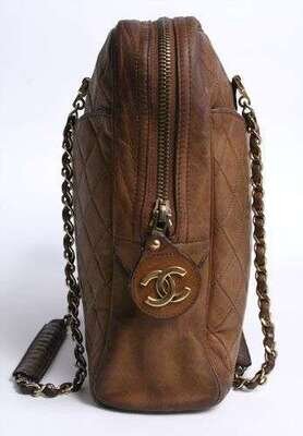 Signature quilted dark tan leather with exterior pockets on either side, two medium-length chain and leather shoulder straps.