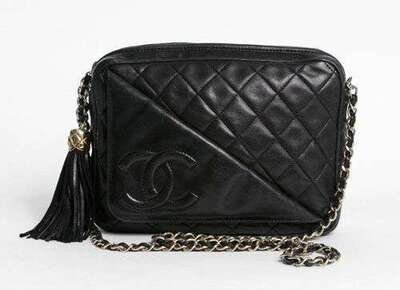 Rectangular top-zip design with signature diamond quilting and diagonal snap-down "CC" logo flap pocket on one side, long single chain shoulder strap and tassel zipper pull.