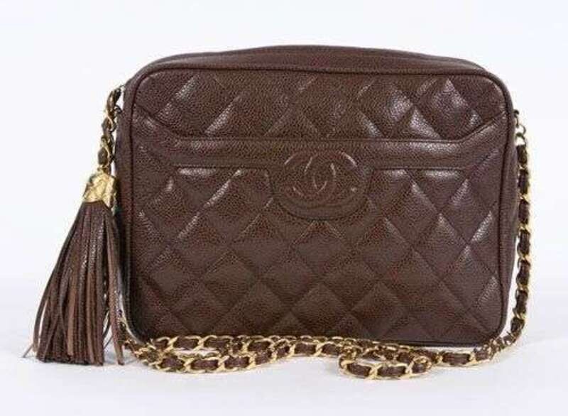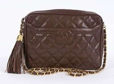 Classic quilted design with pocket and "CC" logo on one side, long single chain shoulder strap and tassel zipper pull.