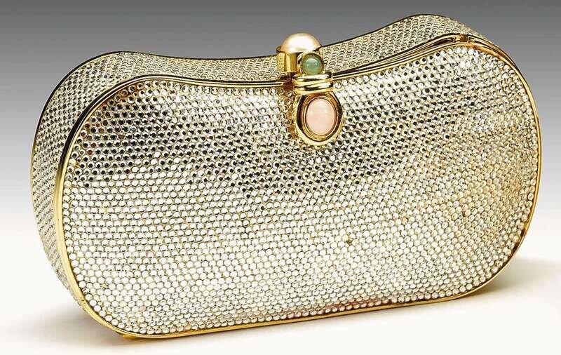 Kidney bean shaped with pave crystal surface, gold and semi-precious cabochon latch, fitted with coin purse, mirror and comb and attached chain.