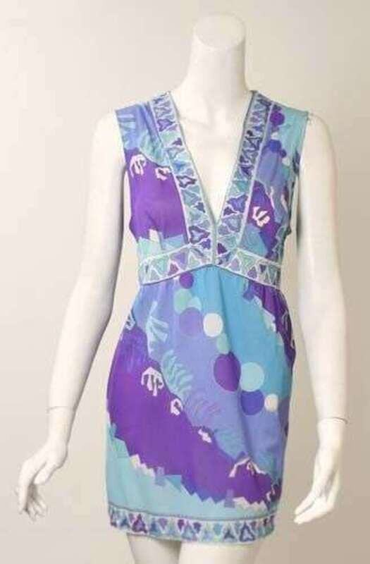Aqua and violet geometric print on nylon, sleeveless V-neck short tunic with an empire waist, by Emilio Pucci for Formfit Rogers.