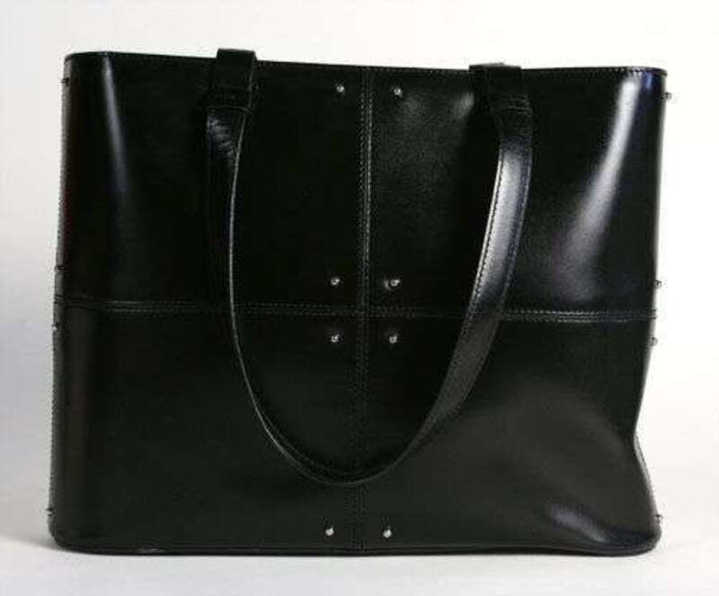 Luggage-grade leather top-handled zip tote with small decorative silver studs.
