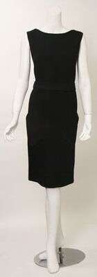 Wool crepe sleeveless tailored day dress with attached belt and slanted patch pockets, back zip, lined in silk. Labeled "Norman Norell for I. Magnin," size 8-10.