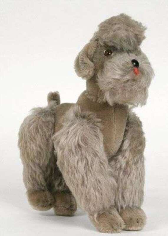 Dove gray with mohair body and glass eyes, movable legs. 8 1/2 inches high.