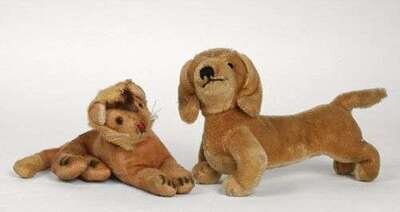 One a Dachshund, about 9 inches long; the other a reclining lion, about 7 inches long not including tail.