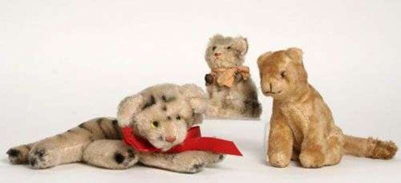 One a reclining striped tabby with red bow, about 11 inches long; one tawny sitting lioness, about 5 1/2 inches high; and a small sitting tabby named "Susi," with paper tag and bell, about 4 inches high.
