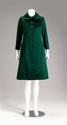 Fitted demure lady-like evening coat, single breasted with rounded collar, narrow sleeves and A-line silhouette. Labeled "Christian Dior Paris / Automne 1971," etc. Size 4.