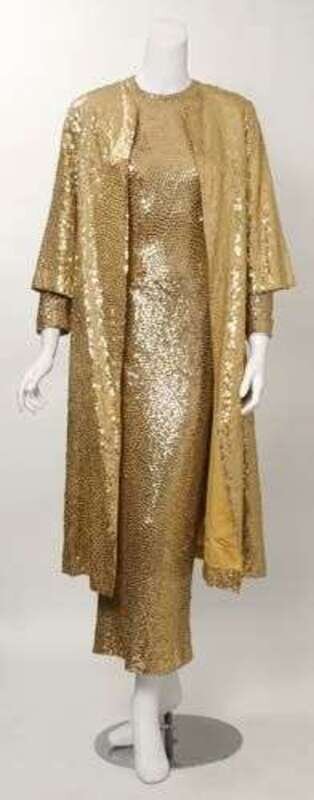 Probably by Norman Norell (but lacking labels), the dress of yellow fine silk jersey and lined in silk, floor length and long sleeve; the coat in matching color on heavier silk with three-quarter sleeves and with an open front, both covered in flat gold sequins. Approximately size 6-8, with repairs to the interior, some areas of lacking sequins, etc.