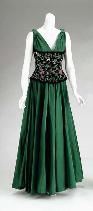 Grass-green silk twill full-circle full-length skirt and sleeveless bodice with plunging V-neckline, flat bow details at the shoulders, wide beaded "grapevine" motif hunter green corset waist. Unlined, interior belt at waist, labeled "Jeanne Lanvin - Paris" and "49 01(?)" handwritten, verso.